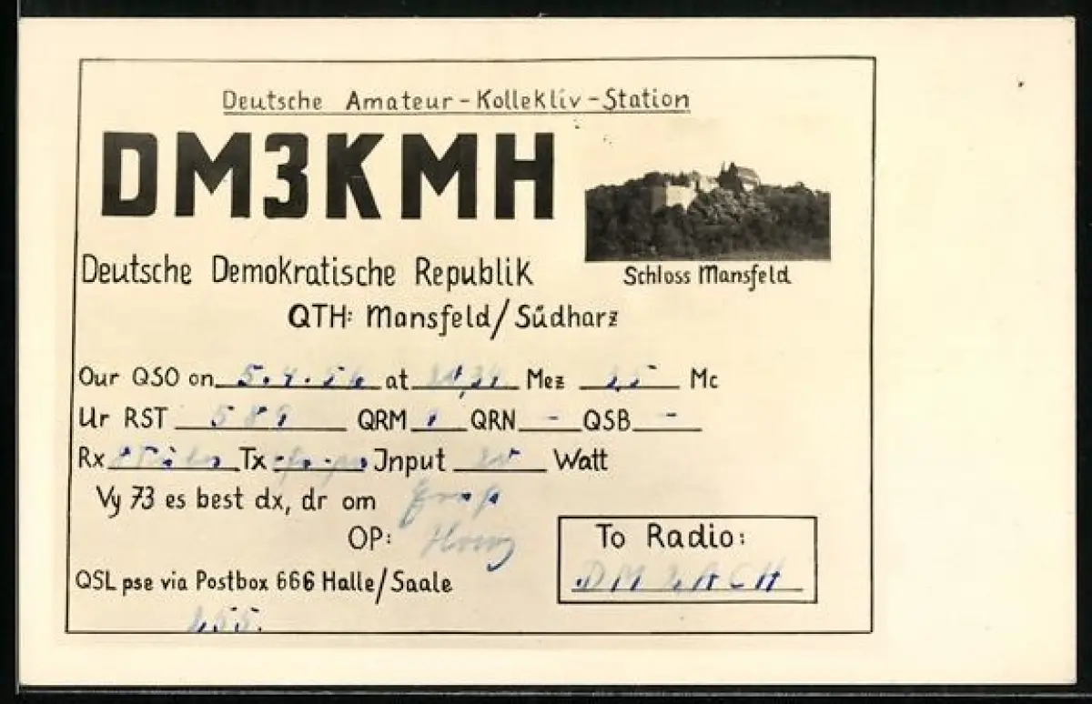 AK Mansfeld /Südharz, Schloss Mansfeld, Deutsche Amateur-Kollektiv-Station DM3KMH DDR, eingegangen 1956