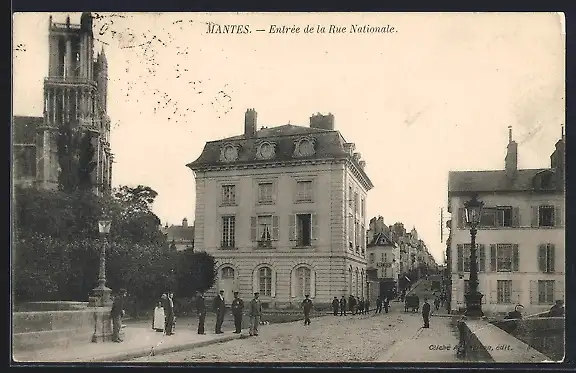 AK Mantes, Entrée de la Rue Nationale, avec Collégiale Notre-Dame