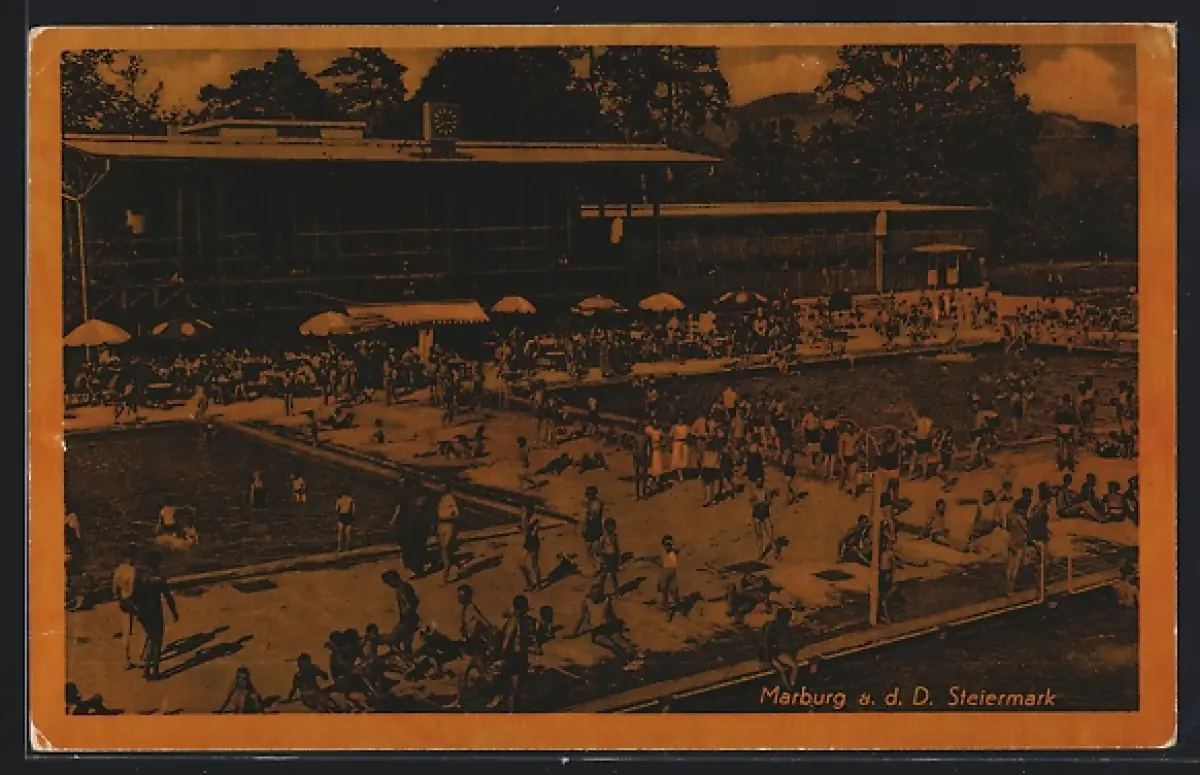 AK Marburg a. Drau, Aufnahme des gut besuchten Schwimmbades