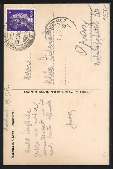 Personenbezogene Daten auf der Rückseite der Karte wurden durch blauen Textmarker unkenntlich gemacht. Die blauen Stellen sind auf die Vorderseite durchgeweicht und wirken sich negativ auf das Postkartenfoto aus