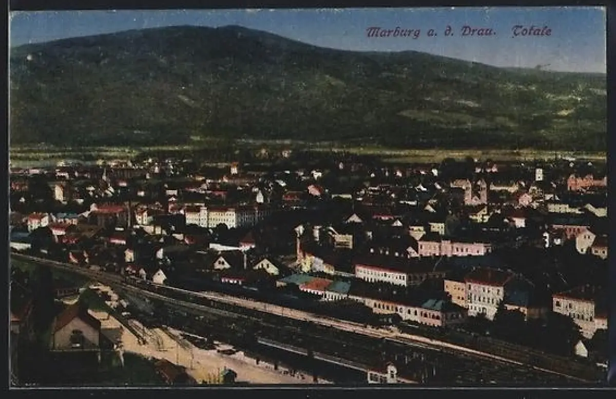 AK Marburg a. d. Drau, Totalansicht mit dem Bahnhof im Vordergrund