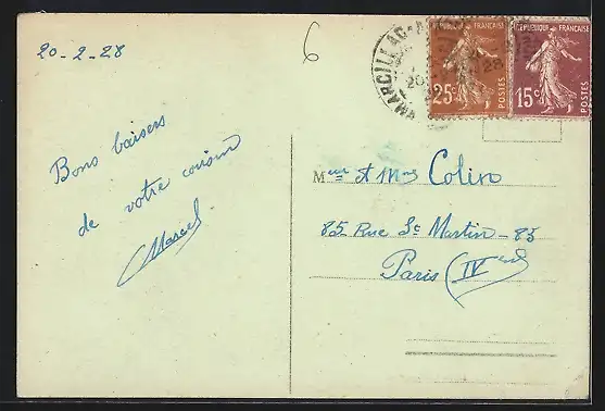 Personenbezogene Daten auf der Rückseite der Karte wurden durch blauen Textmarker unkenntlich gemacht. Die blauen Stellen sind auf die Vorderseite durchgeweicht und wirken sich negativ auf das Postkartenfoto aus
