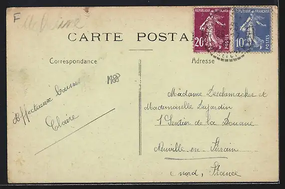 Personenbezogene Daten auf der Rückseite der Karte wurden durch blauen Textmarker unkenntlich gemacht. Die blauen Stellen sind auf die Vorderseite durchgeweicht und wirken sich negativ auf das Postkartenfoto aus