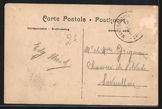Personenbezogene Daten auf der Rückseite der Karte wurden durch blauen Textmarker unkenntlich gemacht. Die blauen Stellen sind auf die Vorderseite durchgeweicht und wirken sich negativ auf das Postkartenfoto aus