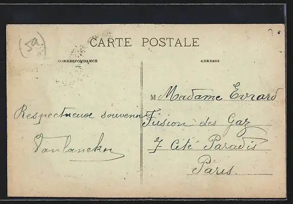 Personenbezogene Daten auf der Rückseite der Karte wurden durch blauen Textmarker unkenntlich gemacht. Die blauen Stellen sind auf die Vorderseite durchgeweicht und wirken sich negativ auf das Postkartenfoto aus