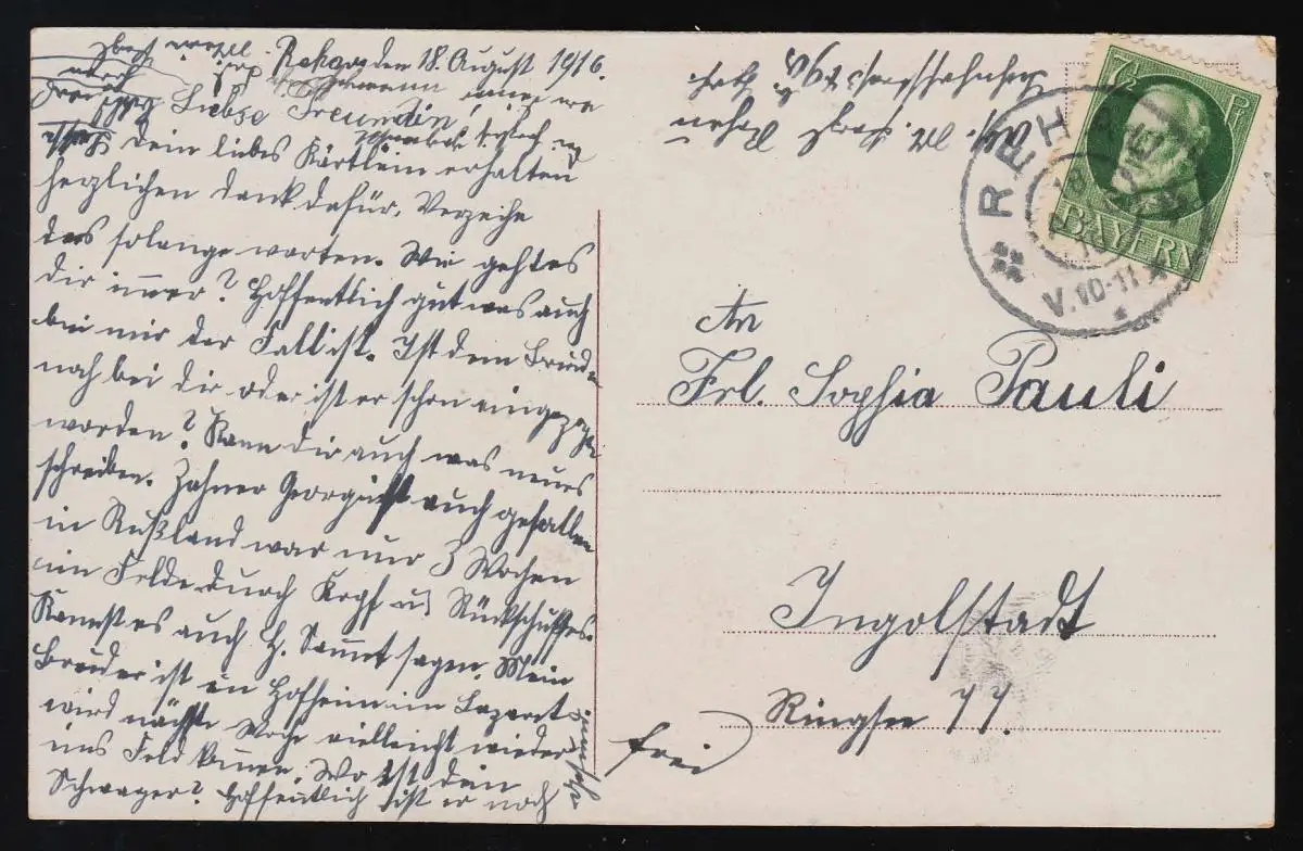 Vers: Lass' ruhen auf dier Karte, Dein Auge mit freundlichem Blick, Die Blumen bringen dir Grüsse, Und wünschen dir viel Glück. Riss im Bereich der Marke + des Stempels.