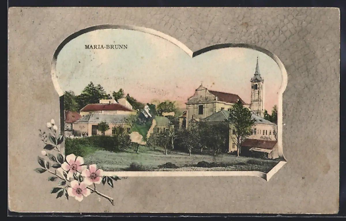 AK Maria-Brunn, Ortspanorama mit Kirche, im Rahmen, Blumen