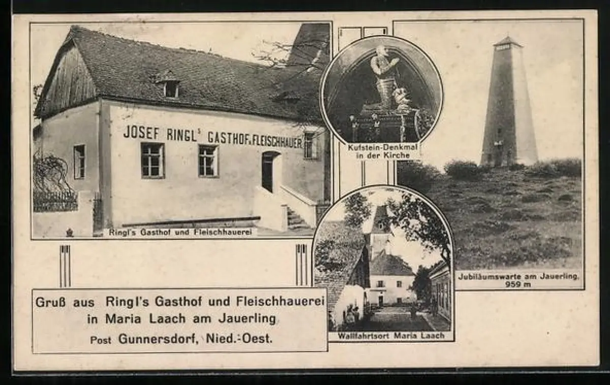 AK Maria Laach am Jauerling, Josef Ringl`s Gasthof, Jubiläumswarte, Kuftstein-Denkmal