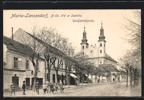 AK Maria-Lanzendorf, Strassenpartie mit Gasthof und Wallfahrtskirche