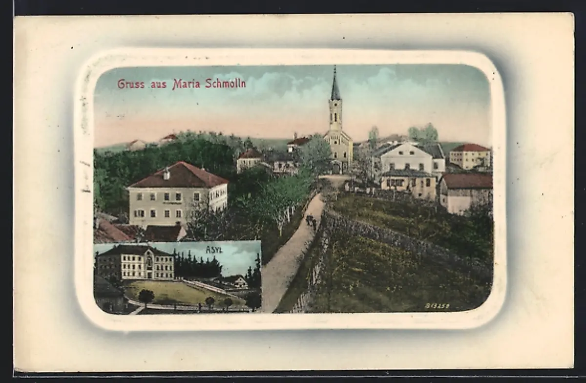 AK Maria-Schmolln, Ortspartie mit Kirche und Landstrasse, Asyl