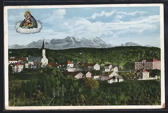 AK Maria Schmolln, Totale, Maria mit Kind auf Wolke