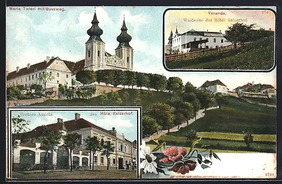 AK Maria Taferl, Vorder Ansicht und Waldseite des Hotel Kaiserhof, Veranda, Kirche