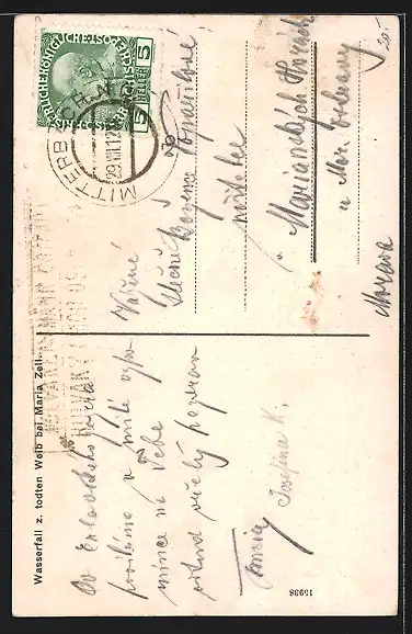 Personenbezogene Daten auf der Rückseite der Karte wurden durch blauen Textmarker unkenntlich gemacht. Die blauen Stellen sind auf die Vorderseite durchgeweicht und wirken sich negativ auf das Postkartenfoto aus