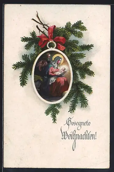 AK Maria und Josef mit dem Christkind, Tannenzweig-Passepartout