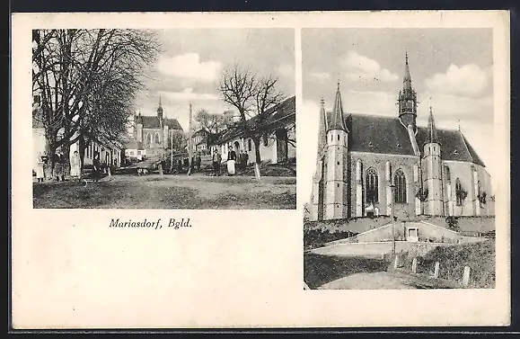 AK Mariasdorf /Burgenland, Strassenpartie mit Kirche u. kleiner Versammlung, Kirche mit Anlage