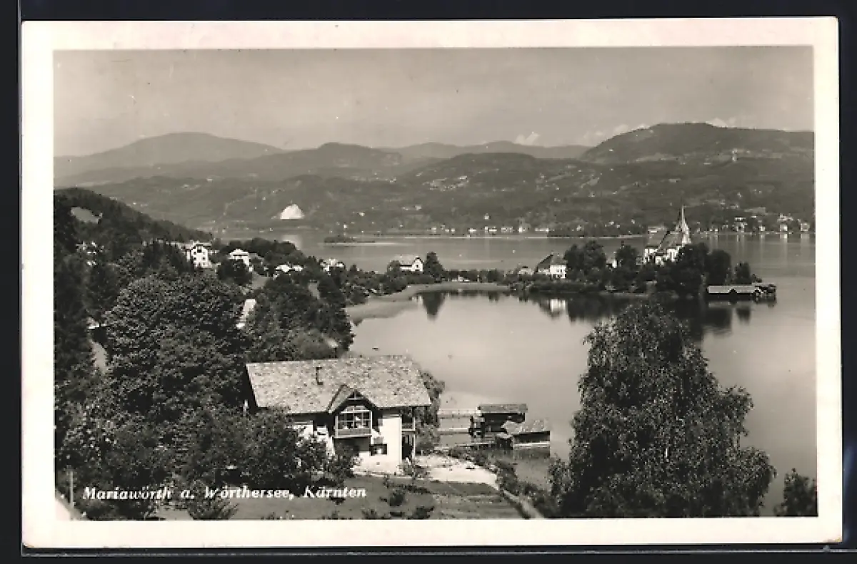 AK Mariawörth am Wörthersee, Ortsansicht mit Kirche und Seeblick