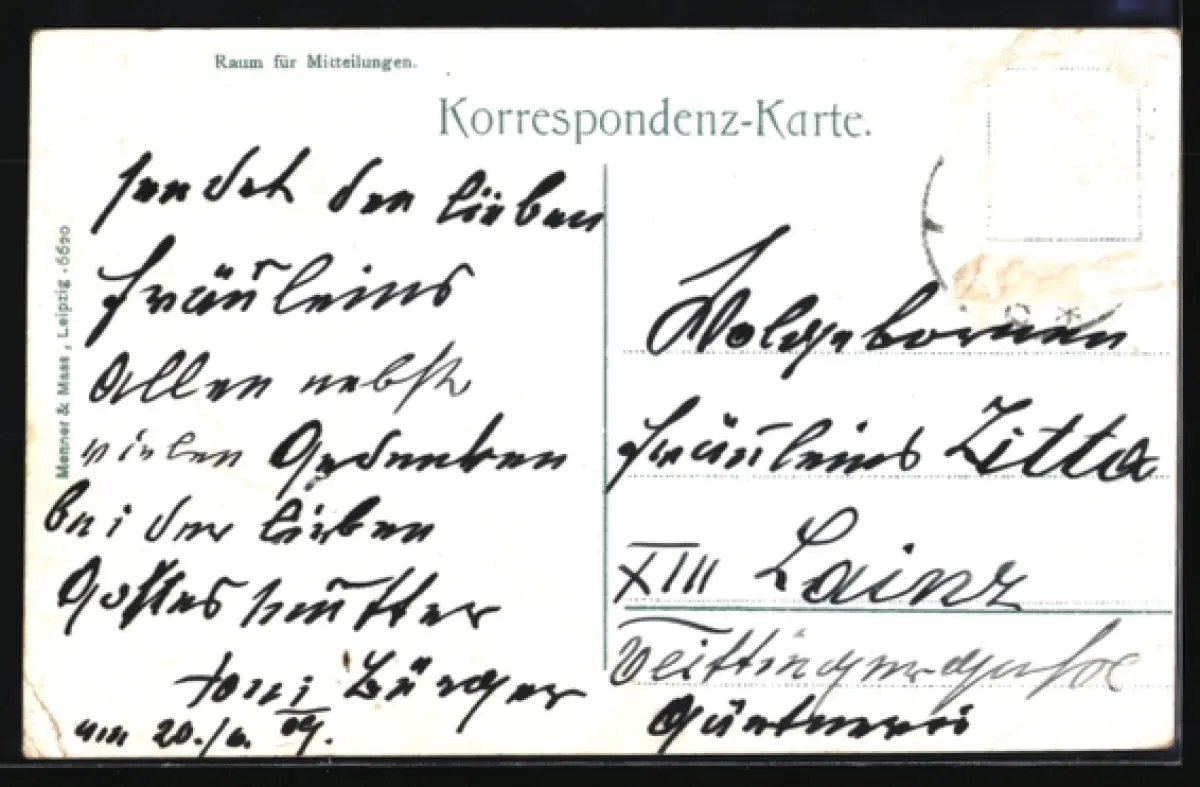 alte Ansichtskarte, gelaufen 1909, Briefmarke entfernt, rückseitig Oberflächenschaden, Eckknick re. unten, guter Zustand
