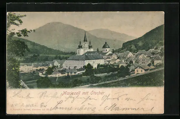 AK Mariazell i. Steiermark, Totalansicht mit Basilika und Oetscher