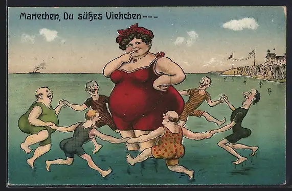 AK Mariechen, Du süsses Viehchen, Männer Tanzen um dicke Frau im Badeanzug Reigen