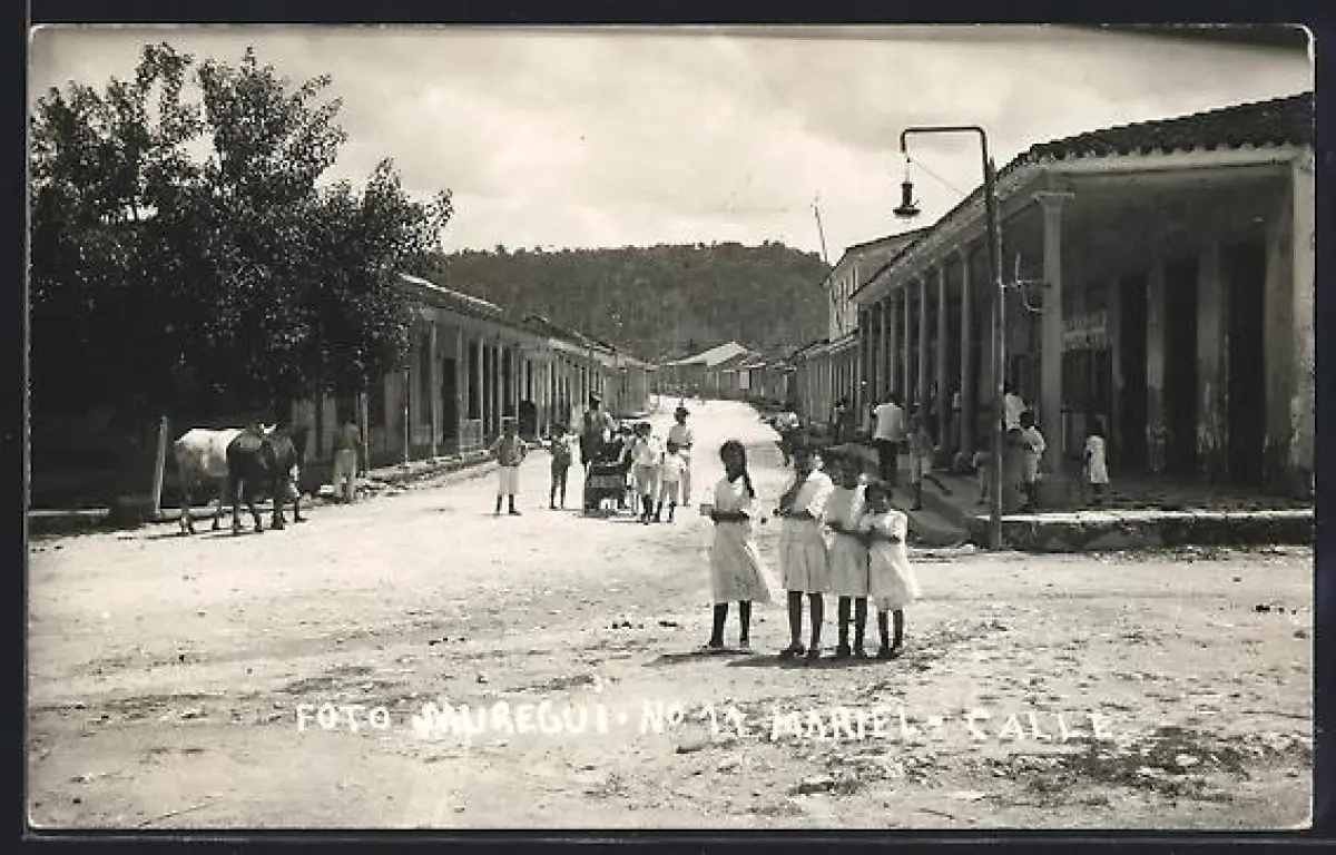 AK Mariel, Strassenpartie mit Säulenbauten und Kindergruppen