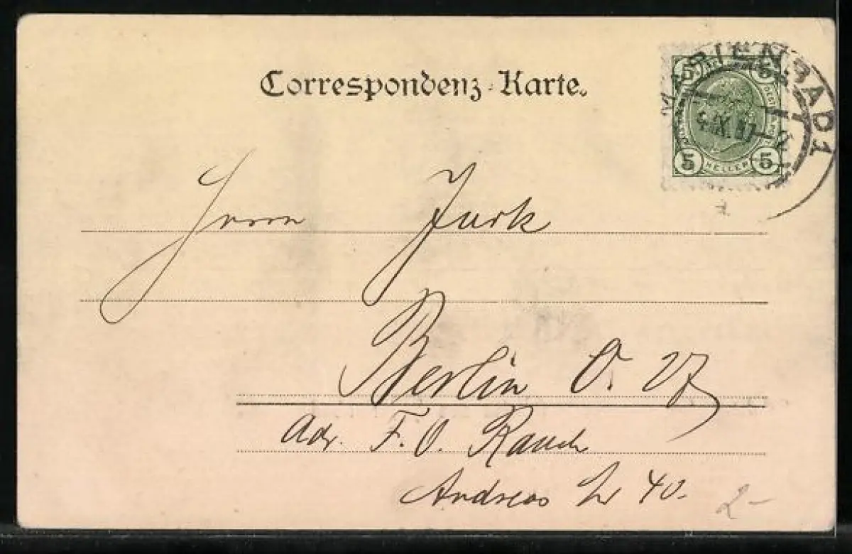 Personenbezogene Daten auf der Rückseite der Karte wurden durch blauen Textmarker unkenntlich gemacht. Die blauen Stellen sind auf die Vorderseite durchgeweicht und wirken sich negativ auf das Postkartenfoto aus