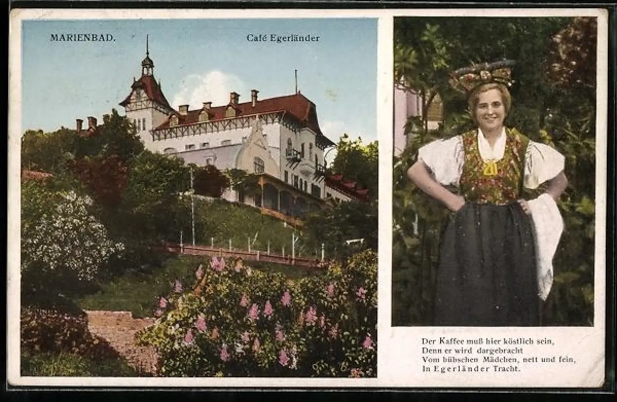 AK Marienbad, Café Egerländer, Frau in Egerländer Tracht