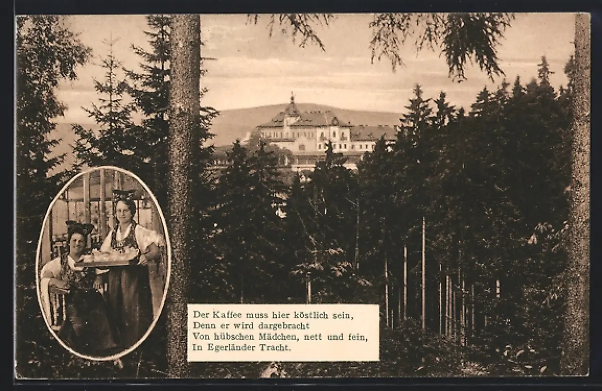 AK Marienbad, Cafe Egerländer, Zwei Frauen in Egerländer Tracht
