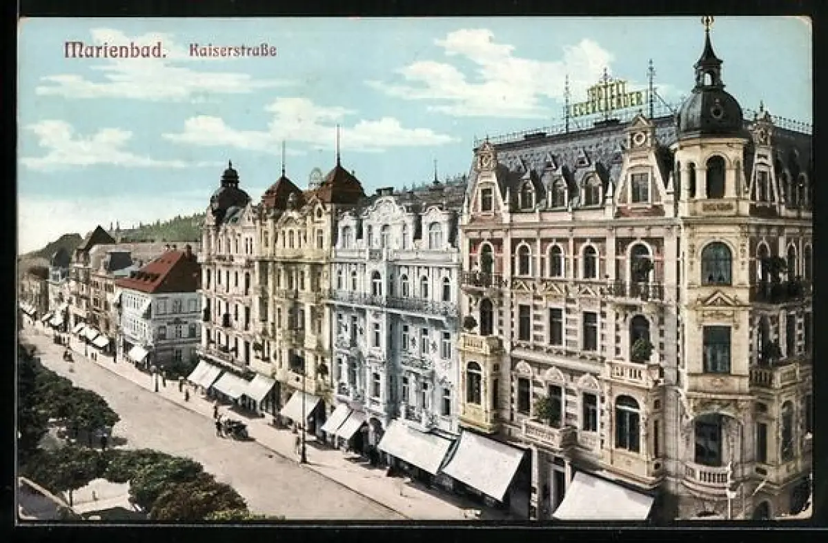 AK Marienbad, Kaiserstrasse mit Hotel Egerländer und Geschäften