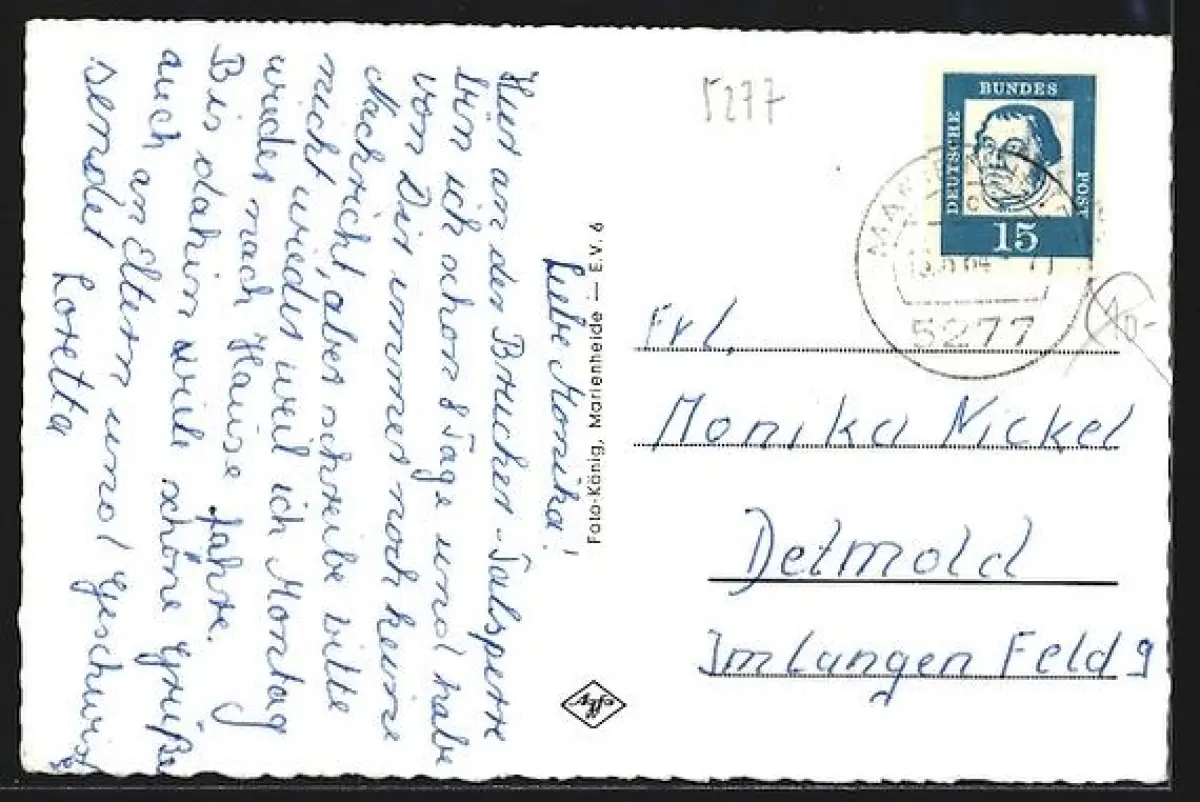 Personenbezogene Daten auf der Rückseite der Karte wurden durch blauen Textmarker unkenntlich gemacht. Die blauen Stellen sind auf die Vorderseite durchgeweicht und wirken sich negativ auf das Postkartenfoto aus