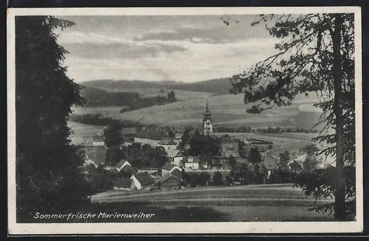 AK Marienweiher, Ortsansicht mit Kirche und Landschaft