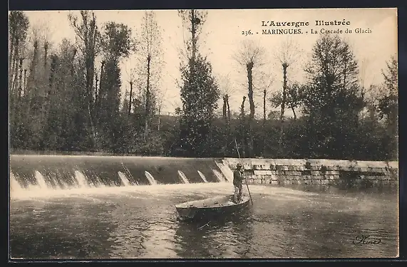 AK Maringues, La Cascade du Glacis, pêcheur sur barque devancant la cascade