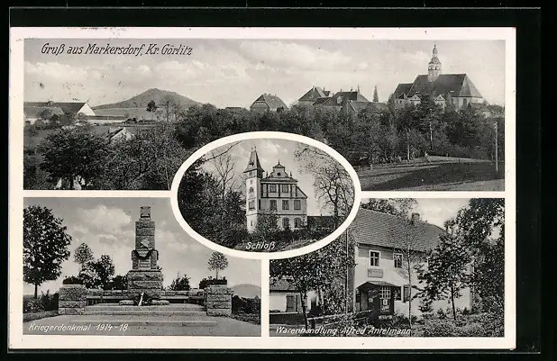 AK Markersdorf /Kr. Görlitz, Handlung Alfred Antelmann, Ortsansicht, Kriegerdenkmal