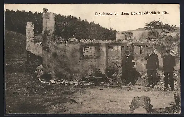 AK Markirch /Els., Eckirch, Männer vor einem zerschossenen Haus