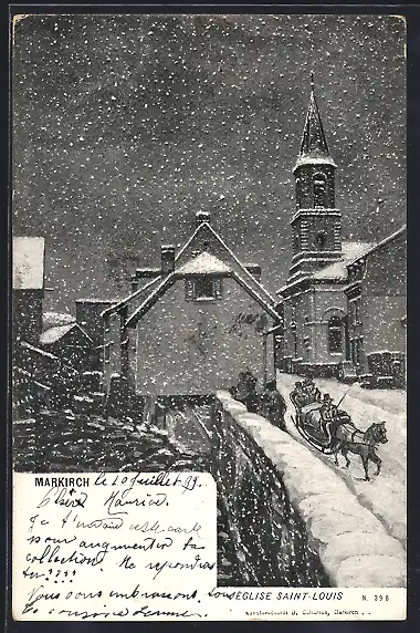 AK Markirch, Kirche Saint-Louis im Schnee, Pferdeschlitten
