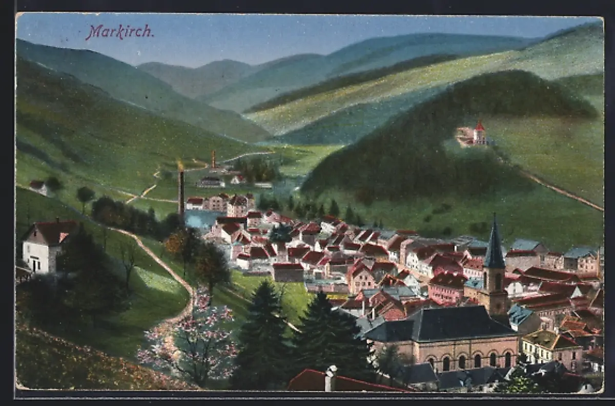 AK Markirch, Vue du village avec église et collines environnantes