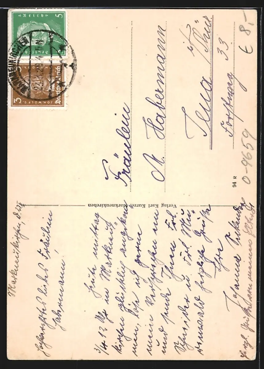 Personenbezogene Daten auf der Rückseite der Karte wurden durch blauen Textmarker unkenntlich gemacht. Die blauen Stellen sind auf die Vorderseite durchgeweicht und wirken sich negativ auf das Postkartenfoto aus