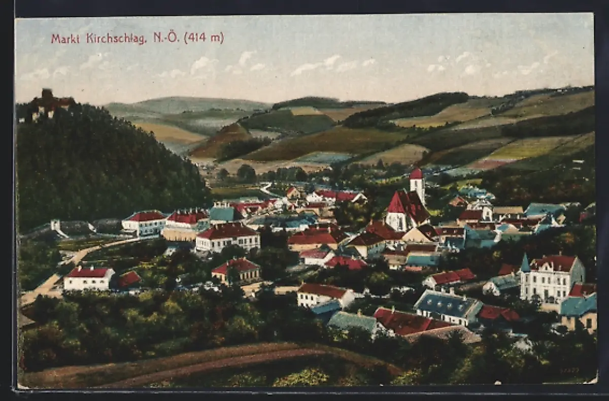 AK Markt Kirchschlag /N. Ö., Totalansicht mit Ruine aus der Vogelschau