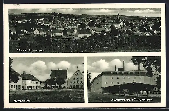AK Markt-Wolnzach, Hopfenaufbereitungsanlage, Marienplatz und Gesamtansicht