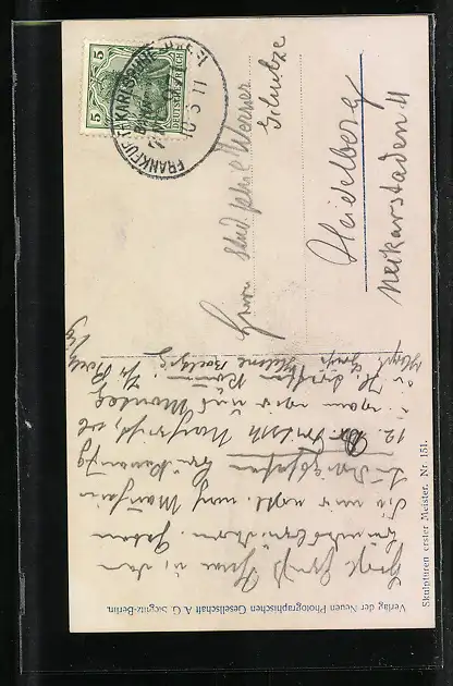 Personenbezogene Daten auf der Rückseite der Karte wurden durch blauen Textmarker unkenntlich gemacht. Die blauen Stellen sind auf die Vorderseite durchgeweicht und wirken sich negativ auf das Postkartenfoto aus