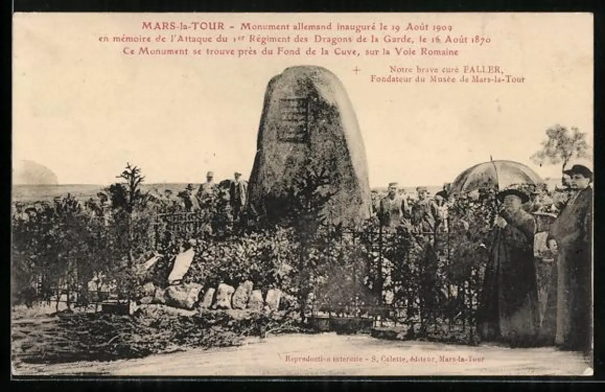AK Mars-la-Tour, Monument allemand inauguré le 19 Aout 1909, Attaque du 1er Reg. des Dragons de la Garde 1870