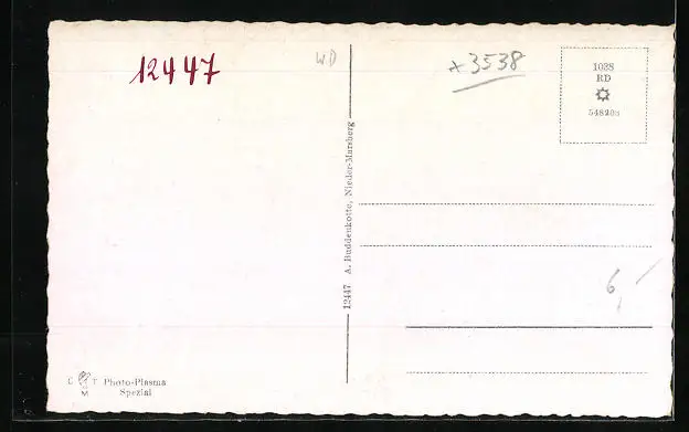 Personenbezogene Daten auf der Rückseite der Karte wurden durch blauen Textmarker unkenntlich gemacht. Die blauen Stellen sind auf die Vorderseite durchgeweicht und wirken sich negativ auf das Postkartenfoto aus