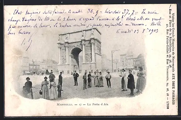 AK Marseille, La Porte d`Aix avec des passants en tenue d`époque