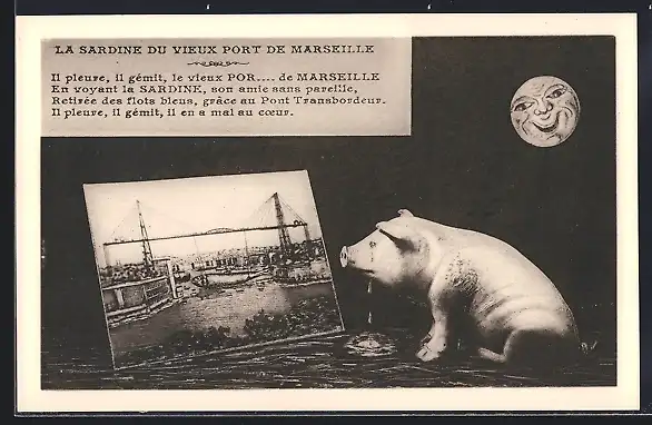 AK Marseille, La Sardine du Vieux Port avec Pont Transbordeur et cochon triste