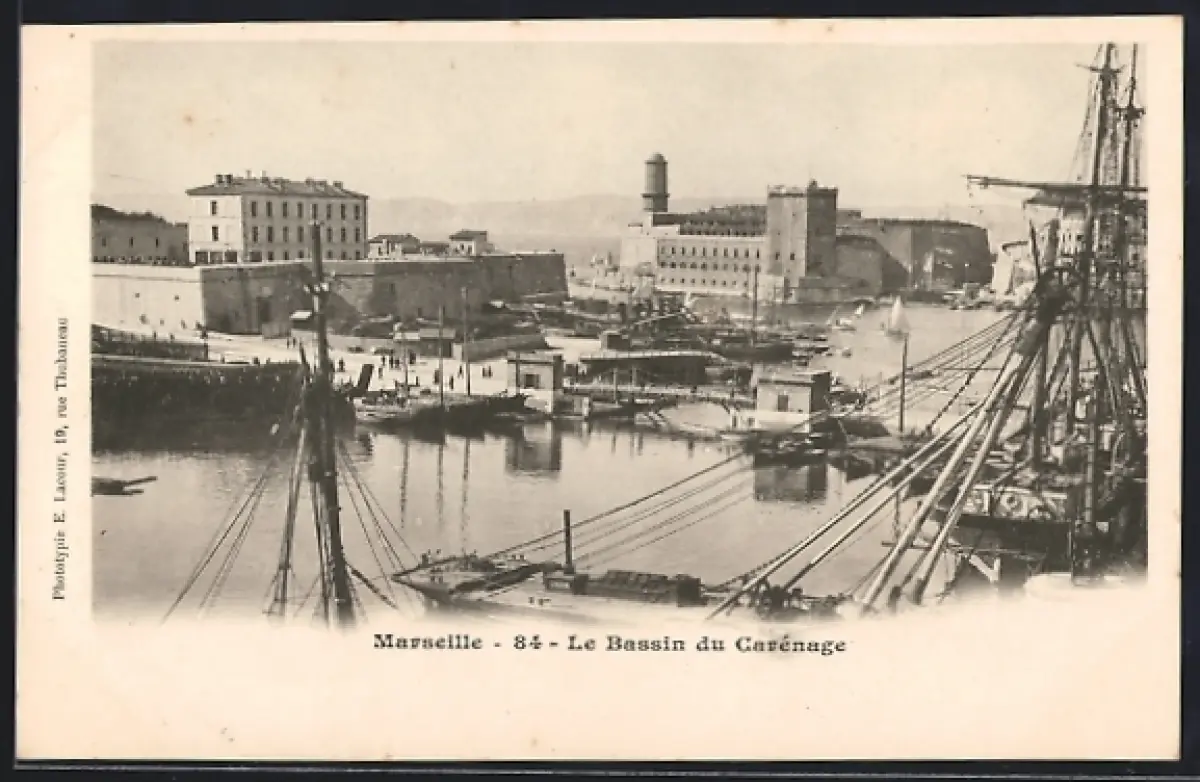 AK Marseille, Le Bassin du Carénage avec des navires et le fort en arrière-plan