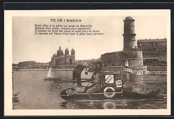 AK Marseille, Taucher auf dem U-Boot Marius , Panorama
