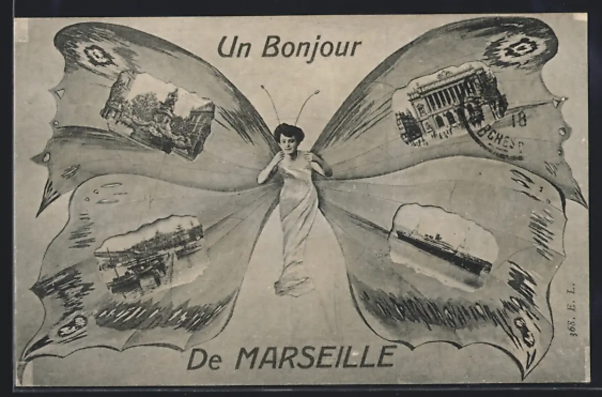 AK Marseille, Un Bonjour de Marseille avec vues intégrées dans les ailes d`un papillon
