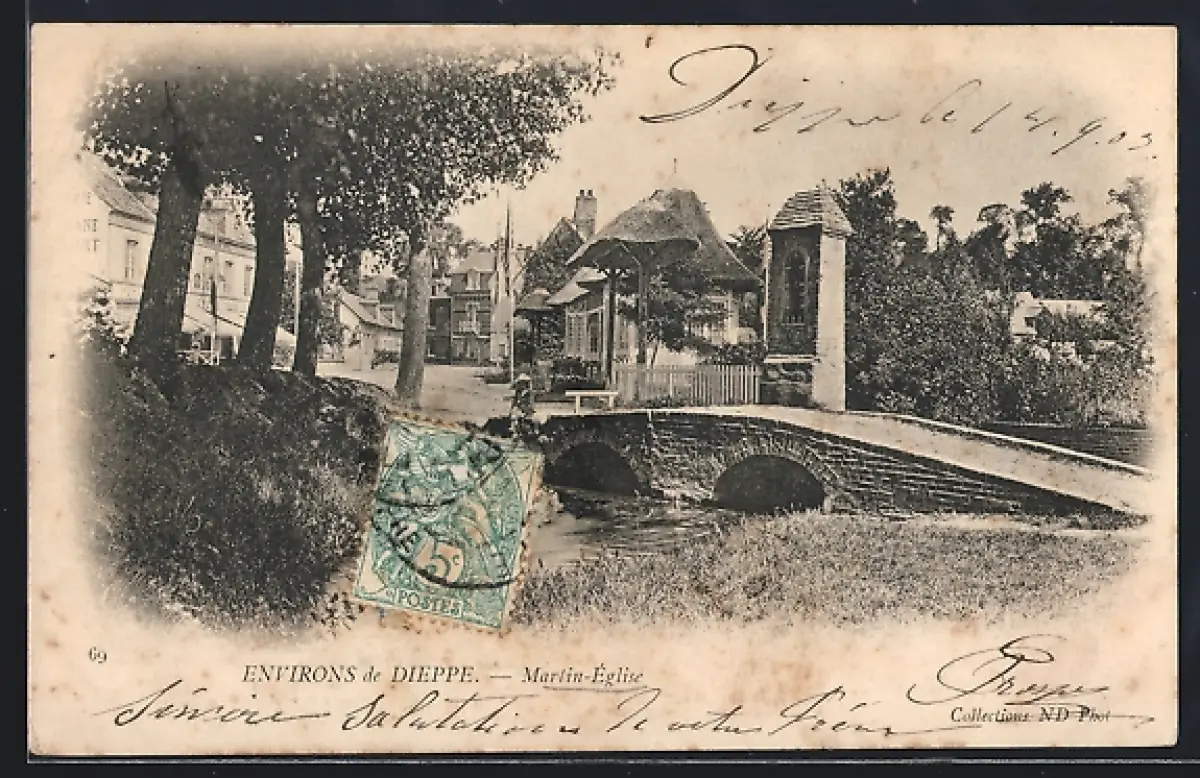 AK Martin-Église, Vue du pont pittoresque et des maisons environnantes