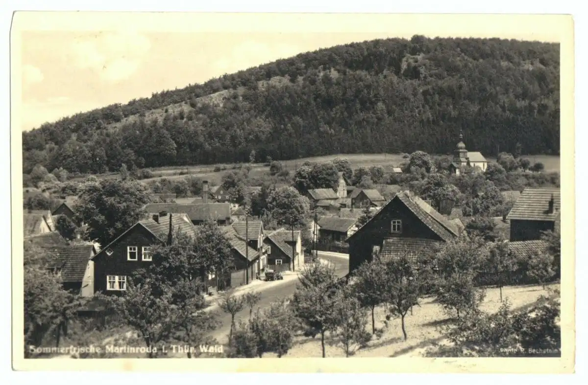 Ansichtskarte Martinroda Thür. Wald, Kr. Ilmenau Teilansicht Erhaltung I-II, rückseitig etwas fleckig postalisch gelaufen, gestempelt: unleserlich Druckvermerk: 1951 Herstellungsland: DDR Verlag: Bechstein-Verlag, Ilmenau
