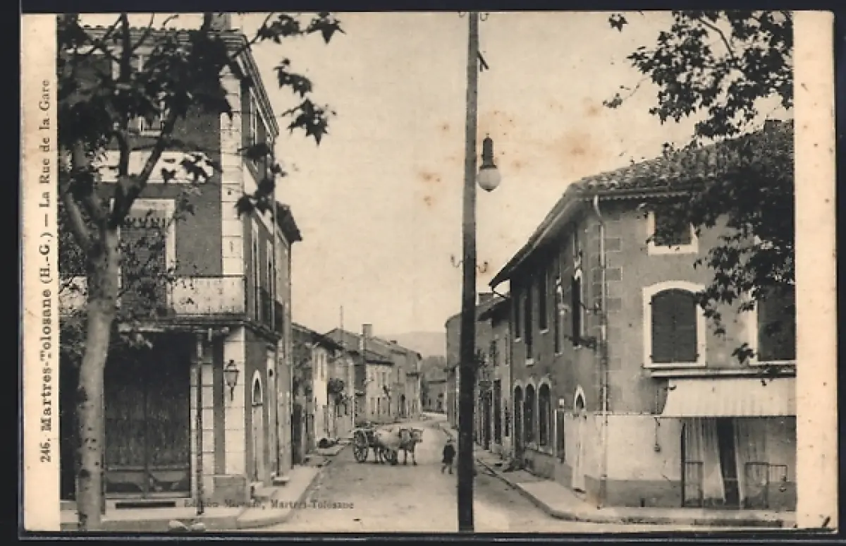 AK Martres-Tolosane, La Rue de la Gare avec charrette à cheval