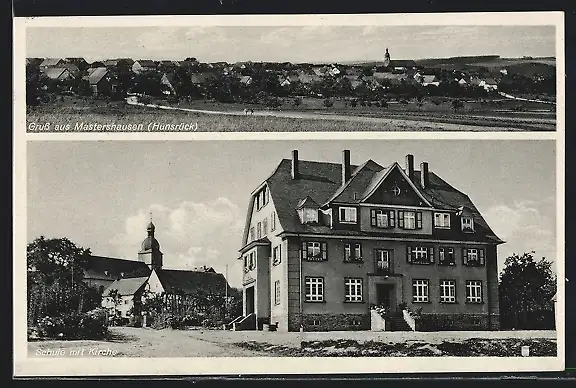AK Mastershausen /Hunsrück, Schule mit Kirche, Totalansicht
